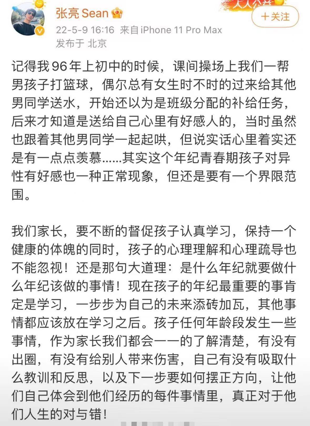 极目新闻记者了解到,天天曾�年被曝恋爱后引发争议。随后,张亮在微博发长文回应,“这个年纪的青春期孩子对异性有好感是一种正常现象,但还是要有一个界限范围。”同时,他强烈谴责在网络上对两名未成年孩子的网暴,并呼吁成年人要保护好每一个孩子,教育孩子的前提是尊重、理解以及引导。